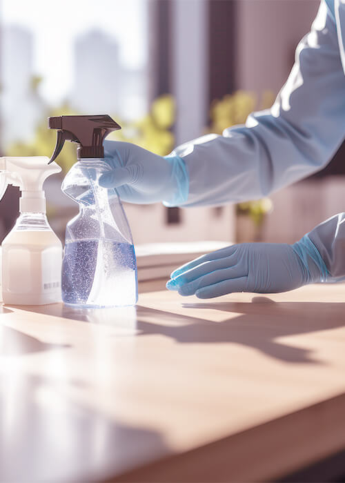 - Wipe down and disinfect door handles, switches, and railings.